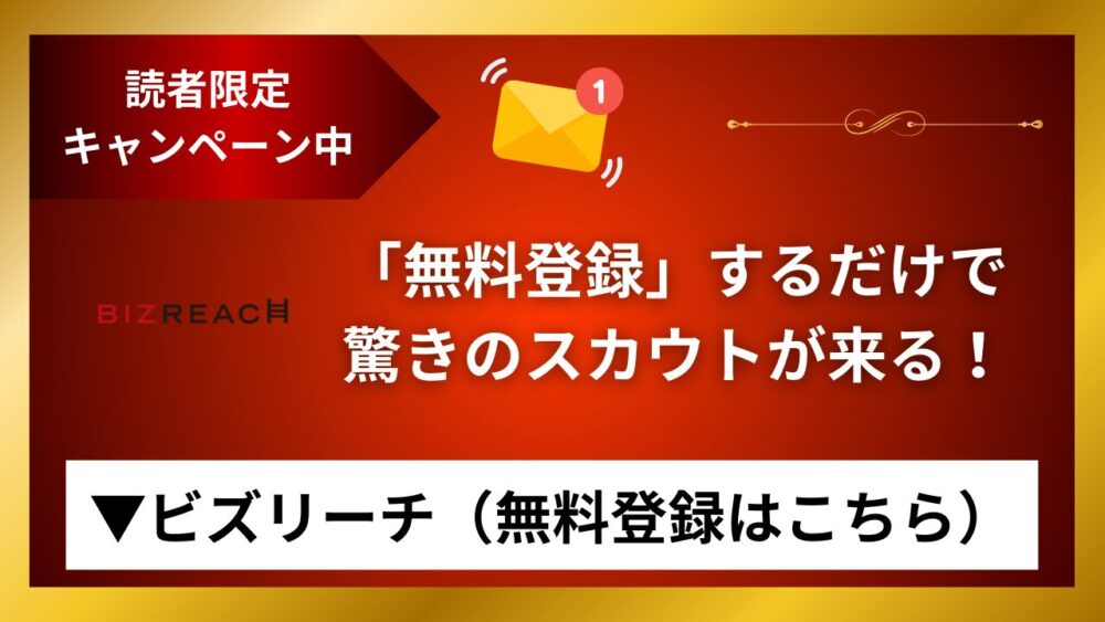 1:【ビズリーチ(無料)◎簡単無料登録◎スカウト型で最強。直近年収400万以上のあなたに最適。